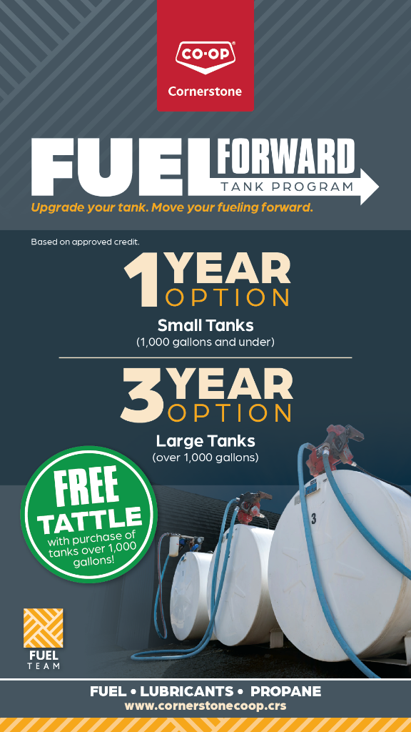 Upgrade your tank and move your fueling forward with Cornerstone Co-op’s Fuel Forward Tank Program. Whether you're expanding your operation or replacing aging fuel storage, we offer safe, flexible, and convenient solutions, paired with payment options designed to fit your farm's needs. Based on approved credit.