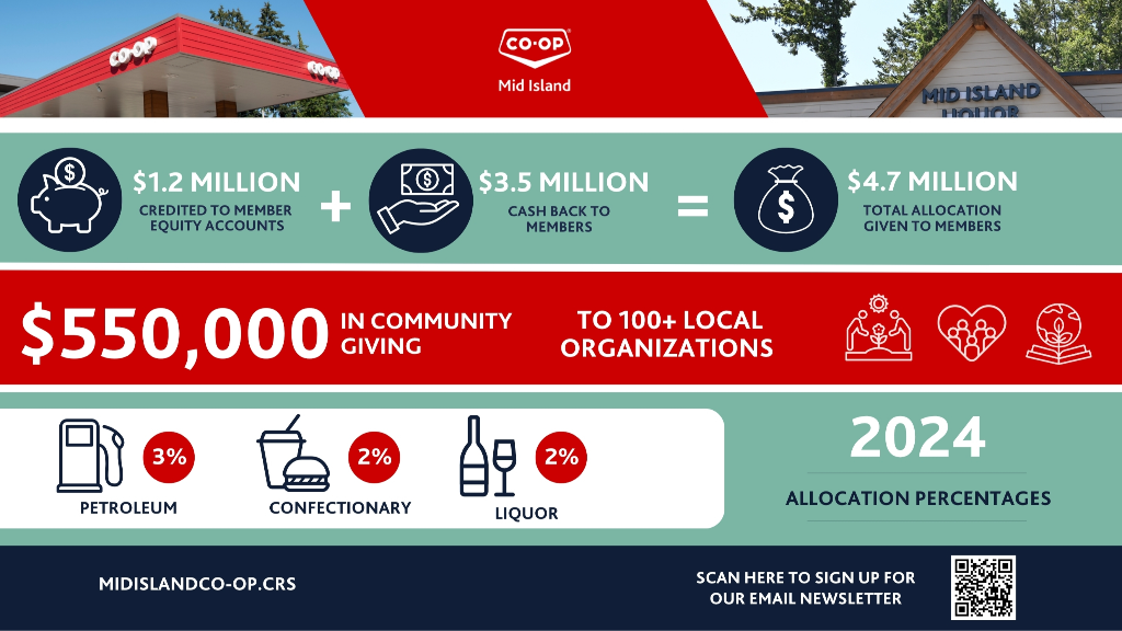 By buying and retaining a membership in Mid Island Co-op, you are a part owner. Each time you make a purchase at one of our gas bars, cardlocks, and convenience or liquor stores and give your membership number, your purchase amount is recorded. At the end of the fiscal year, based on the financial performance of your Co-op, a portion of your purchases may be returned in the form of an equity allocation. As a member owner the more you purchase, the more you can receive back in a combination of equity and cashback. - What does my patronage return cover?