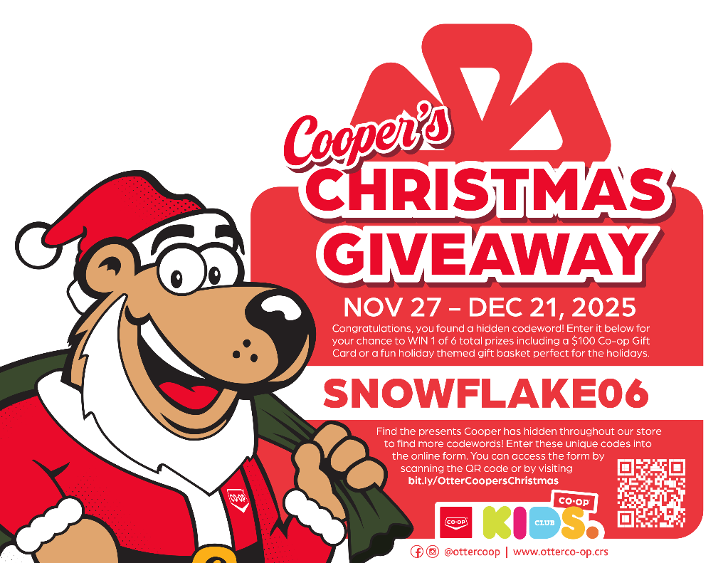 Cooper has been extra busy getting ready for Christmas this year! He’s been zooming through our Otter Co-op Food Stores, tucking away colourful little presents in all sorts of sneaky spots. And guess what? Each present has a secret codeword waiting just for YOU!