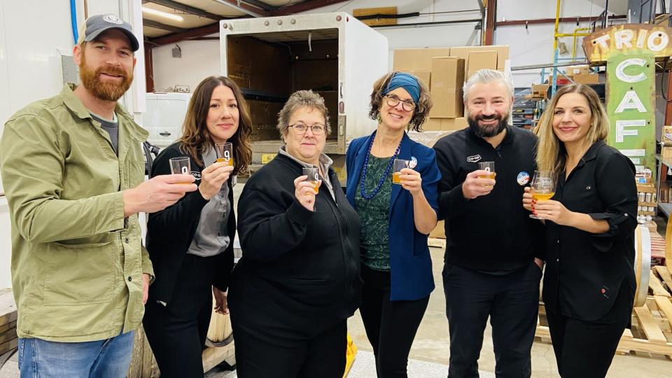 Several months ago, our sommeliers had the opportunity to tour the 9 Mile brewery, where they witnessed the beer-making process, from milling the barley and mashing it to convert it to sugars, selecting the hops, and sampling the wort. They also transferred the beer into wine barrels from Burrowing Owl Vineyards for a quick aging process.